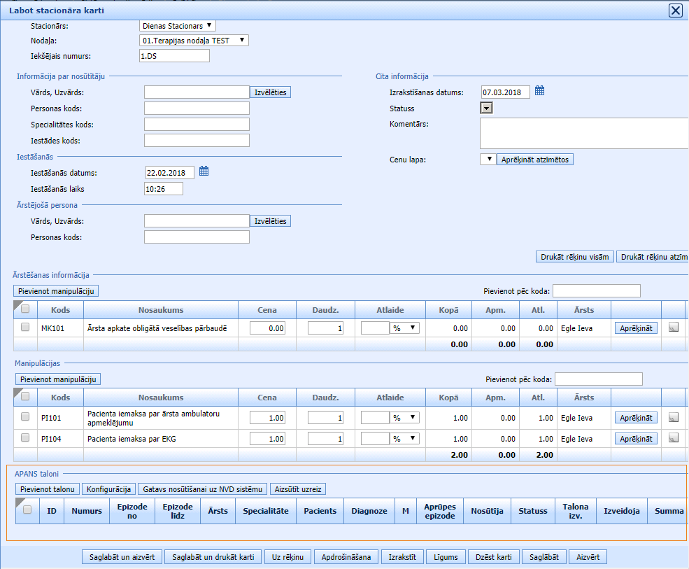 APANS talona veidošana un sūtīšana no dienas stacionāra kartes