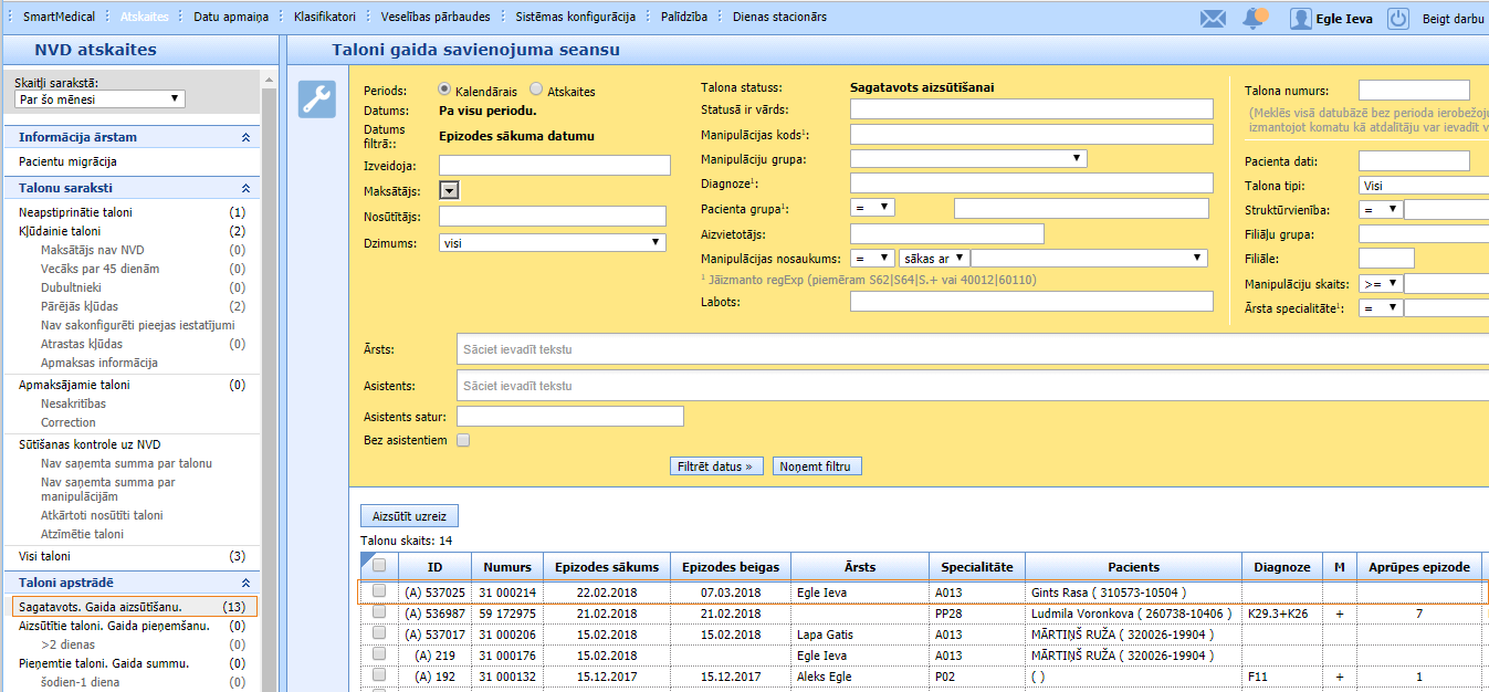 • Aizsūtīt uzreiz – atzīmējot APANS talonus stacionāra kartes sekcijā “APANS taloni” vai NVD atskaišu sarakstā un klikšķinot pogu “Aizsūtīt uzreiz”, talons tiks sūtīts uz NVD VIS un būs atrodams aizsūtīto NVD talonu sarakstā (sk. sarakstu sadaļā Atskaites > NVD atskaites) vai statusu dienas stacionāra kartes sekcijā “APANS taloni”: