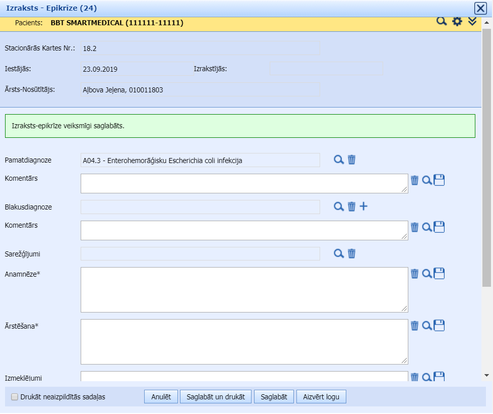 Klikšķinot “Izveidot izrakstu“, atveras forma “Izraksts-epikrīze” ar pacienta diagnozi un iespēju rakstīt komentārus pie diagnozēm, aizpildīt informāciju par anamnēzi, rekomendācijas utml. Klikšķinot pogu “Saglabāt“, tiek attēlots paziņojums uz zaļa fona par veiksmīgu dokumenta saglabāšanu.
