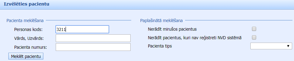Nosūtījuma saskarnei jābūt nokonfigurētai, lai tā nodrošinātu šo iespēju – skat. aprakstu! Klikšķinot izvēli + Izveidot jaunu nosūtījumu, vispirms jāveic pacienta meklēšana: