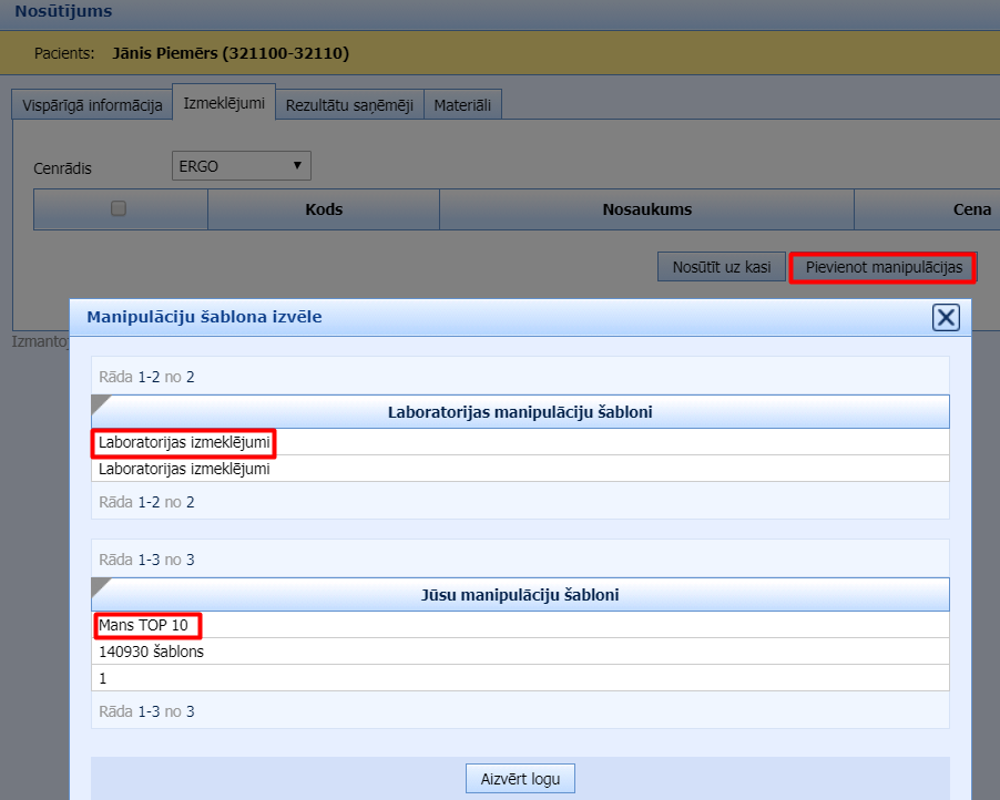 Lai nosūtījumam pievienotu nepieciešamās manipulācijas, nosūtījuma formas lapiņā “Manipulācijas” klikšķina pogu “Manipulācijas” un izvēlas šablonu no lietotāja vai kopīgajiem laboratorijas manipulāciju šabloniem:
