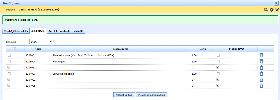 Attēlotajā tabulā izvēlas, kuras manipulācijas ir par maksu, tās ieķeksē un nosūta apmaksai, klikšķinot “Nosūtīt uz kasi“.Pēc manipulāciju nosūtīšanas uz kasi manipulāciju tabulā ķeksīši izvēles rūtiņās vairs netiek attēloti: