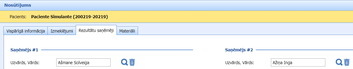 Nosūtījuma formas lapiņā “Saņēmēji” norāda ārstniecības personas, kas saņems analīžu rezultātus (izvēle no NVD klasifikatora):