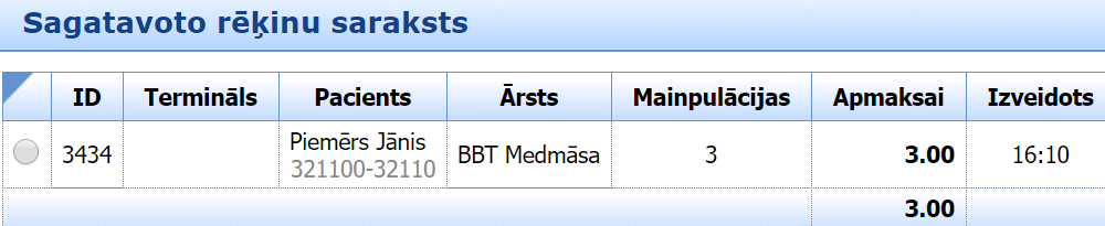 Norēķinu modulī pacientam ir sagatavots rēķins ar maksas manipulācijām. Manipulācijām kā izpildītājs tiek attēlots ārsts, kurš tika norādīts laboratorijas nosūtījumu vispārīgo iestatījumu formā: