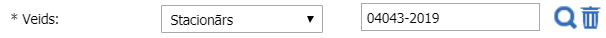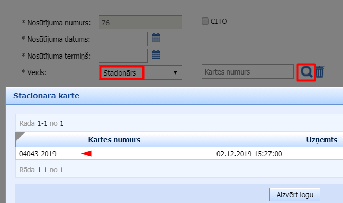 Pacientiem, kam ir stacionāra karte vai dienas stacionāra karte, laukā “Veids“, izvēloties atbilstošu opciju (šajā gadījumā – “Stacionārs“) skat. attēlu zemāk , tiks attēlots ieraksts ar stacionāra kartes informāciju, uz kura jāuzklikšķina, lai nosūtījumā attēlotu stacionāra kartes numuru: