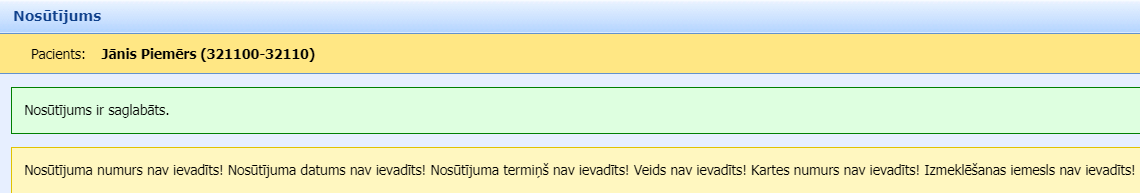 Nosūtījumu var saglabāt jebkurā brīdī, lai nezaudētu tajā ievadīto informāciju.Tiek attēlots informatīvs paziņojums uz zaļa fona par informācijas saglabāšanu un informatīvs paziņojums uz dzeltena fona par neaizpildītiem laukiem: