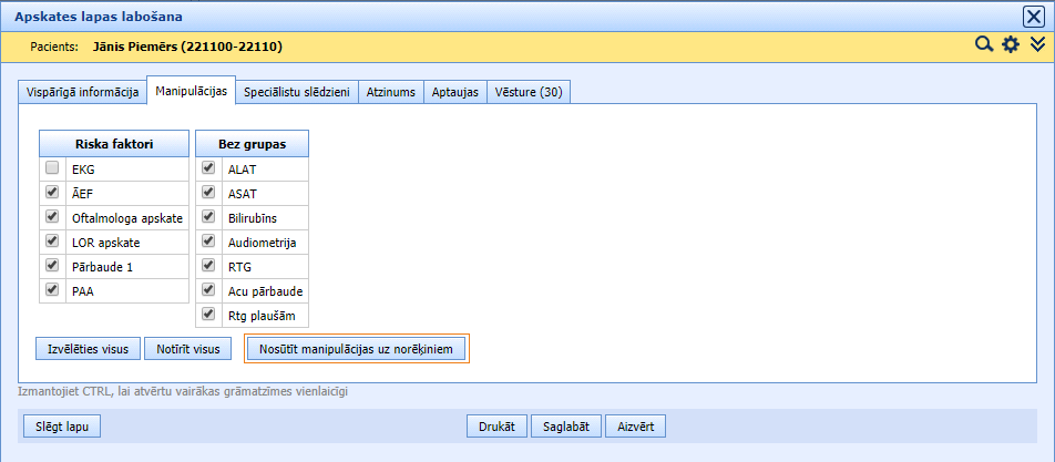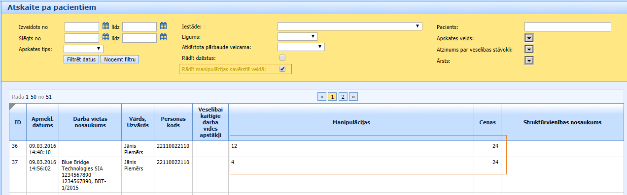 Atskaite “Veselības pārbaudes > Atskaites > Pa Pacientiem” ir paplašināta ar opciju meklētajā “Rādīt manipulācijas savērstā veidā”. Izvēloties šo opciju, atskaite izskatīsies šādi: