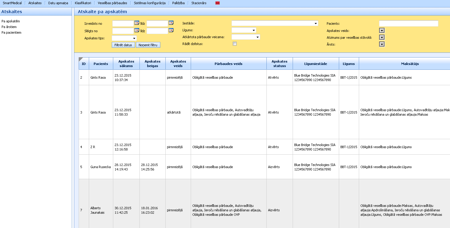 Atkarībā no informācijas, kuru ir nepieciešams atlasīt ir izveidoti 3 atskaišu veidi: “Pa apskatēm”, “Pa ārstiem” un “Pa pacientiem”. Katrā atskaitē ir vairāki filtri: izveidots no līdz, apskates tips, iestāde līgums, ārsts uc.