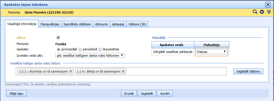 Izvēloties maksātāju “Maksas” apskates lapā, apakšsadaļā “Manipulācijas” parādās jauna poga “Nosūtīt uz norēķiniem”. Spiežot to, izvēlētās (nedzēstās) manipulācijas tiek nosūtītas uz Norēķinu moduli un tiek pievienotas pacienta Apskates lapai. Tie manipulāciju kodi, kas neattiecās uz maksas pakalpojumiem – netiks sūtīti uz Norēķiniem. Norēķinu modulī nosūtītām manipulācijām tiek pievienota cena no cenrāža pēc noklusējuma. Manipulāciju sadaļā pretī nosūtītam manipulācijām tiks rādīta atzīme par to, ka manipulācijas tika nosūtītas uz Norēķiniem un tos atkārtoti nosūtīt uz Norēķiniem nevar.