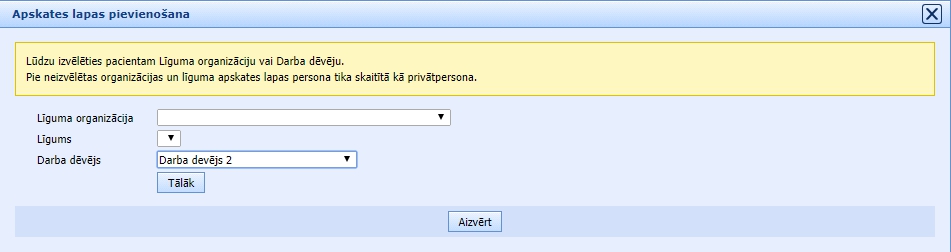 Veidojot jaunu pacienta apskates lapu, laukā Darba devējs izvēlas vērtību no izkrītošā saraksta:
