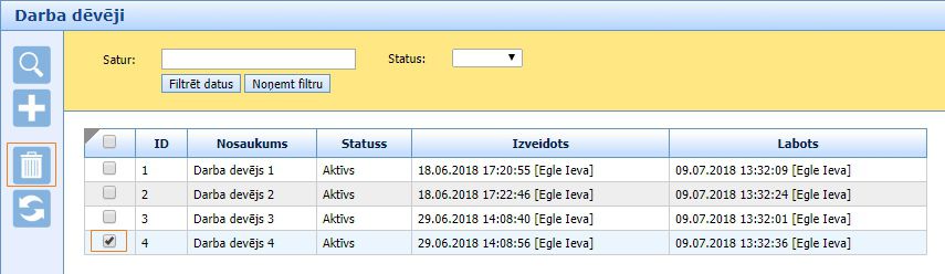 Lai izdzēstu Darba devēju no saraksta, ar ķeksīti atzīmē nevajadzīgo rindu un klikšķina uz ikonas “Dzēst”