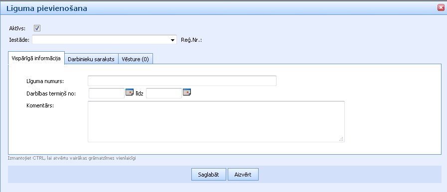 Kā arī jāievada līgumi: numurs, darbības termiņš, komentārs. Līgumam uzreiz var pievienot darbinieku sarakstu, importējot datus no excel vai ievadot manuāli.