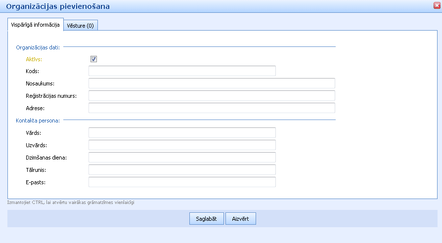Sistēmas sadaļā “Līgumi” ir jāpievieno informācija par organizācijām: kods, nosaukums, reģistrācijas numurs, adrese, informācija par kontaktpersonu.