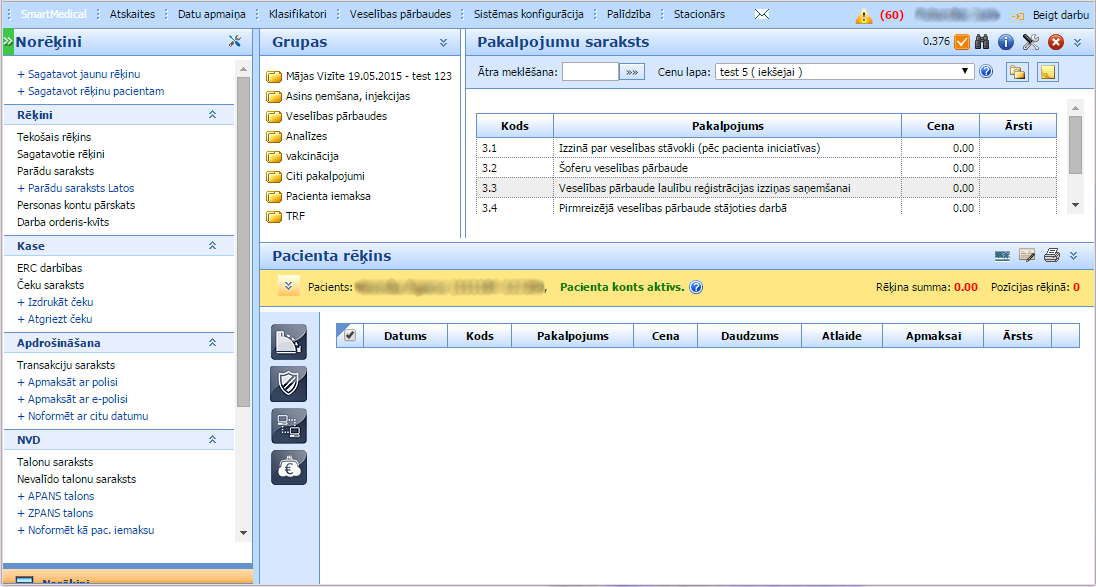 Sistēma atvērs norēķinu sadaļu, kurā Jūs varat izvēlēties attiecīgas manipulācijas, norādīt cenas un izrakstīt rēķinu.