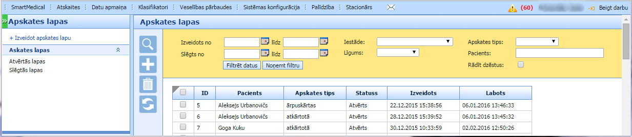 Sadaļā Veselības pārbaudes -> Apskates lapas pacienta apskates lapas formai ir opcija pariet no esošas sadaļas uz “Norēķinu” sadaļu, lai piestādītu pacientam rēķinu. Izvēloties pacientu no apskates lapu saraksta, klikšķinām uz to.