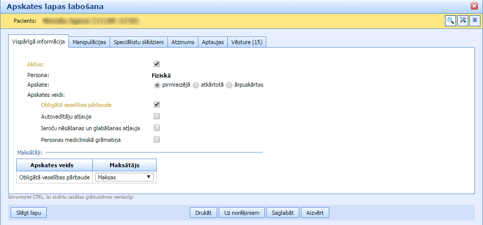 Atvērsies logs “Apskates lapas labošana”, kurā blakus pogām “Drukāt” un “Saglabāt” ir poga “Uz norēķiniem”. Kad veselības pārbaudes pacientam ir pabeigtas un pienāk laiks izrakstīt rēķinu, tad spiežam šo pogu “Uz norēķiniem”.