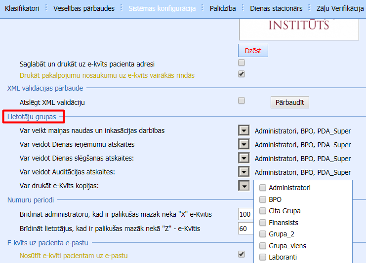 Katru minēto atskaišu sagatavošanas iespēju var atļaut noteiktai lietotāju grupai. Lietotāju grupas, kas būs tiesīgas sagatavot katra tipa atskaites norāda saskarnē Sistēmas konfigurācija>Kase/norēķini>e-Kvīts konfigurācija>e-Kvīts iestatījumi, izvēloties no izkrītošā saraksta – iepretim katrai darbībai.