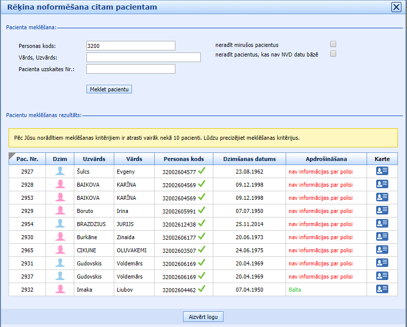 Meklējot pacientu, sarakstā var redzēt detalizētu informāciju par pacientu un apdrošināšanas polisi. Papildināt informāciju par pacientu vai viņa polisi var, klikšķinot pogu “Pacienta karte”.