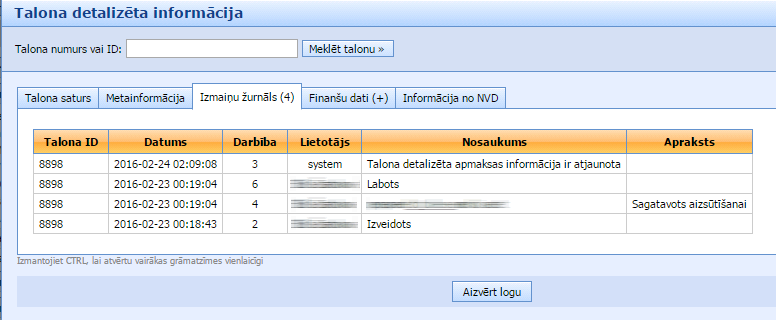 , atvērsies jauns informatīvs logs ar talona detalizētu informāciju. Atlasīt nepieciešamo informāciju var spiežot uz loga apakšsadaļām: Talona saturs, Metainformācija, Izmaiņu žurnāls, Finanšu dati un Informācija no NVD.