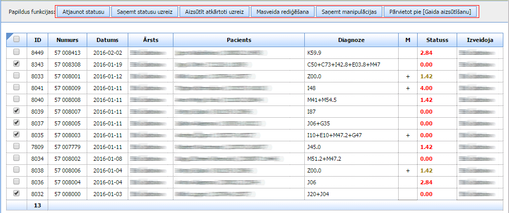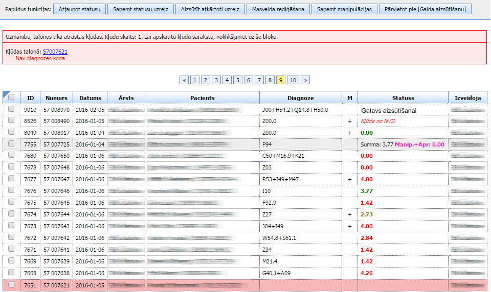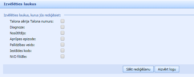 - masveida rediģēšana – atzīmēto talonu lauku rediģēšana: talona sērija vai numurs, diagnoze, nosūtītājs, aprūpes epizode, palīdzības veids, iestādes kods, NVD filiāle;
