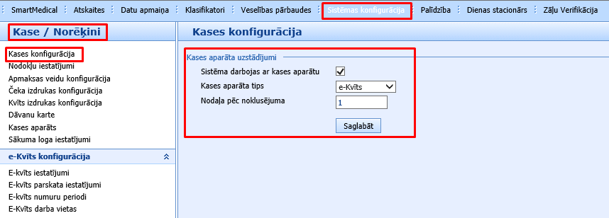Sadaļā Kases konfigurācija izvēlas kases aparāta tipu –e-kvīts. Gadījumā, ja pakalpojumam nodaļa navdefinēta, veidojot e-kvīti, PVN tiek aprēķināts pēc noklusējuma nodaļas.