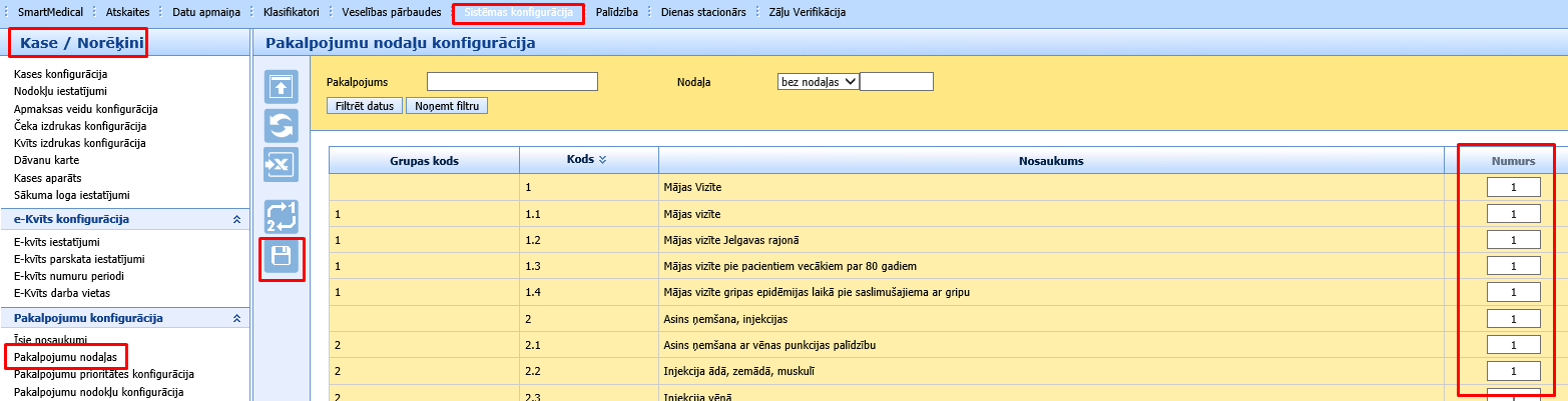SmartMedical sadaļā Sistēmas konfigurācija -> Kase /Norēķini -> Nodokļu iestatījumi ir jānorāda nodaļas numuru pie attiecīgasPVN likmes: