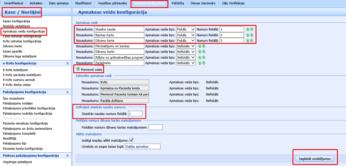 Sadaļā Apmaksas veidu konfigurācija nepieciešamspievienot apmaksas veidus ar tipu Fiskāls, piešķirt tiem unikālus numurus un ierakstīt skaidras naudas maksājuma numuru ailē “Skaidras naudas numurs fiskālā”.
