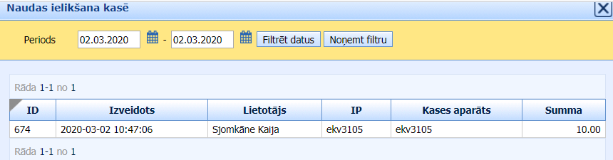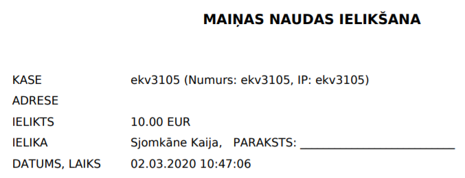 Pēc naudas ielikšanas vai izņemšanas no kases (poga “Izpildīt un izdrukāt“) lietotājam tiek attēlots šīs darbības protokols, kuru var izdrukāt un/vaisaglabāt: