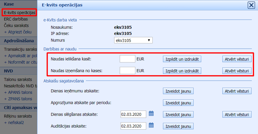 Sadaļā Norēķini -> Kase -> E-kvīts operācijas var reģistrēt naudas ielikšanas un izņemšanas darbības.