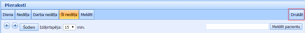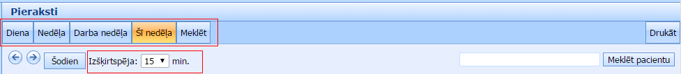 Augšējā izvēlnē spiežot uz pogas „Meklēt” varat atrast tuvāko brīvo laiku pierakstam izvēlētam ārstam.Ekrāna augšējā daļā (blakus pogai „Šodien”) ir iespējams mainīt ekrānā redzamo laika intervāla iedaļas izmēru, mainot to izvēlnē „Izšķirtspēja”. Mainot šo iestādījumu, Jums automātiski mainīsies arī ekrānā izšķirtspēja (cik daudz rezervāciju uzreiz Jūs varēsiet apskatīt).