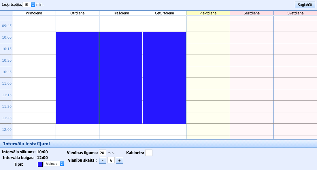 Klikšķinot “+“, var izveidot jaunu veidni (pierakstu grafiks, kas atkārtosies katru nedēļu), norādot tās derīguma termiņu. Šeit nosaka vienas vizītes ilgumu (var būt atšķirīgs katram secīgajam intervālam) un telpu, kurā ārsts pieņem.