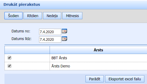 klikšķina pogu „Parādīt”, lai sarakstu izdrukātu vai saglabātu pdf formātā. Pēc saraksta attēlošanas klikšķina pogu „Drukāt” šīs atskaites izdrukāšanai.vai arī klikšķina pogu „Eksportēt excel failu”, lai iegūtu excel failu.