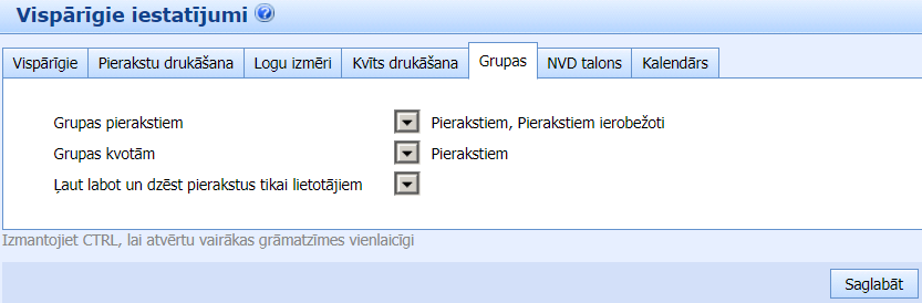 - Lai, veicot pierakstu pie ārsta, atzīmētu kvotas, sadaļā “Grupas” norāda tās lietotāju grupas, kurām jāparādās sadaļā “Kvotas“.