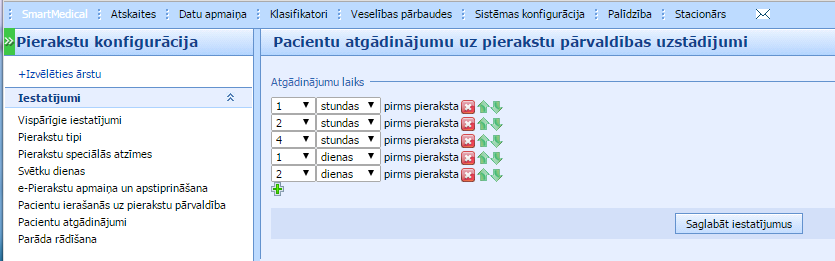 Šie iestatījumi ir nepieciešami, lai pierakstot pacientu, nodrošināt noteikto atgādinājumu savlaicīgi – konkrētu stundu laikā pirms pieraksta vai konkrētu dienu laikā pirms pieraksta.