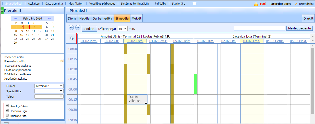 Pierakstu pārskata logā Jūs varat attēlot vairāk nekā vienu ārstu un attiecīgi redzēt noslodzi vairāk nekā vienam ārstam, kā arī pārvietot/kopēt pierakstus starp ārstiem. Lai mainītu attēlojamo ārstu sarakstu, sānu izvēlnē ārstu sarakstā atzīmējiet vairākus ārstus. Attēlojums tiks izmainīts (papildināts).