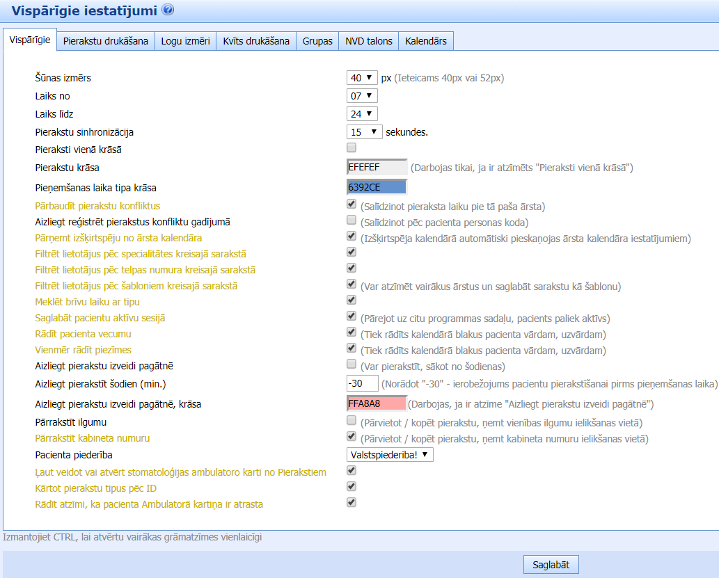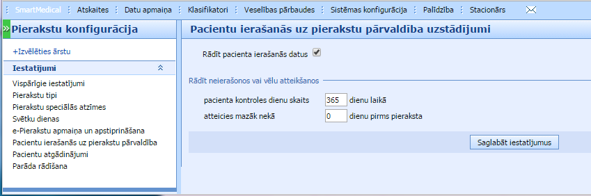 Sadaļā Sistēmas konfigurācija -> Pierakstu konfigurācija saglabājam iestatījumus par pacienta ierašanas datiem:- rādīt/nerādīt atzīmi par pacienta ierašanās- radīt neierašanos vai vēlu atteikšanos, nosakot kontroles dienu intervālu un dienas, kad pacients atteicies no pieraksta pirms konsultācijas.