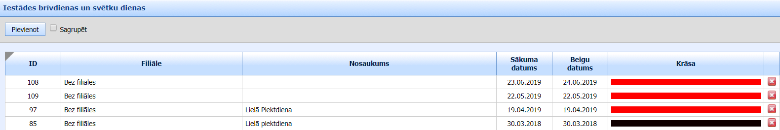 - pievienot jaunu svētku dienu, brīvdienu periodu, klikšķinot pogu „Pievienot”,