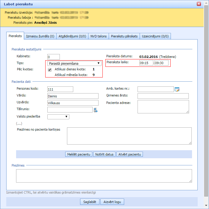 • Klikšķinot pogu „Labot pierakstu” atveras forma “Labot pierakstu” ar iespēju veikt labojumus (laiks, tips, kvota, komentārs utml.).