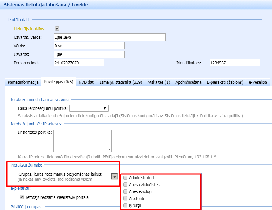 Sadaļā Sistēmas konfigurācija > Sistēmas lietotāji > Ārsta vai speciālista lietotāja profilā, lapiņā “Privilēģijas” ir iespēja ierobežot ārsta/speciālista pierakstu kalendāra pieejamību citiem lietotājiem iestādes/prakses ietvaros. Izvēlnē “Pierakstu žurnāls” (SKAT. ATTĒLU) ieķeksē lietotāju grupas, kuras redzēs izvēlētā lietotāja pieņemšanas laikus un saglabā iestatījumus. Pārējiem lietotājiem šī lietotāja kalendārs nebūs pieejams.
