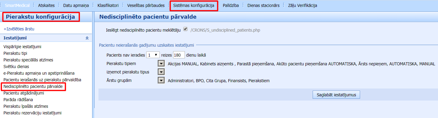 Ir pacienti, kas pierakstās pie ārsta, bet uz vizīti neierodas. SmartMedical pierakstu modulī ir iespēja pieraksta formā attēlot paziņojumu par pacienta nedisciplinētību. Iespēju ieslēdz sadaļā “Sistēmas konfigurācija > Nedisciplinēto pacientu pārvalde“, ieķeksējot izvēles rūtiņu. Zemāk definē, kādā gadījumā un attiecībā uz kādiem pierakstu tipiem pacients tiks uzskatīts par nedisciplinētu. Pēc noklusējuma sistēma ņem vērā informāciju par pacienta neierašanos pēdējo 6 mēnešu laikā: