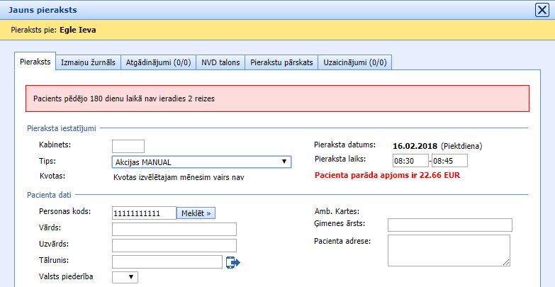 Ja iespēja ieslēgta, pēc pacienta personas koda ievadīšanas pieraksta veidošanas formā tiek attēlots paziņojums uz sārta fona: