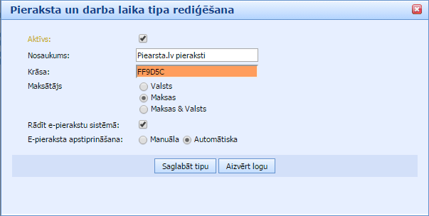 - ka pieraksta tips ir aktīvs, ieķeksējot izvēles rūtiņu “Aktīvs“,