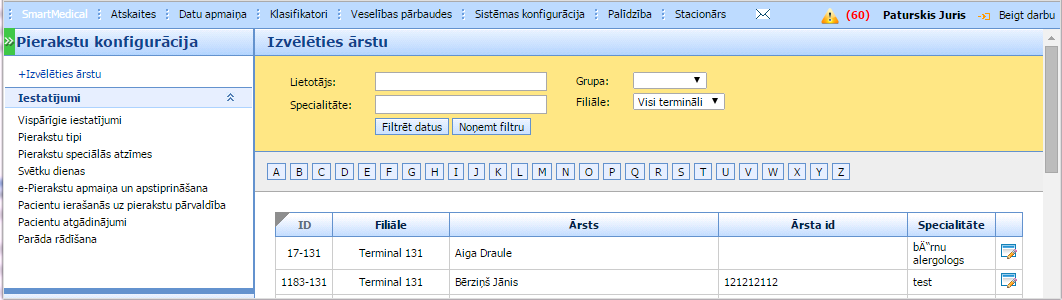 Piezīme: iestādei ar vairākām filiālēm pirms darba grafika konfigurēšanas formas augšdaļā izvēlas konkrēto filiāli, kurai tiks sagatavots ārsta darba grafiks. Pēc filiāles izvēles ir redzams tai piesaistīto ārstu saraksts. No saraksta izvēlas ārstu un tad konfigurē ārsta nedēļas veidni noteiktam kalendārajam periodam.
