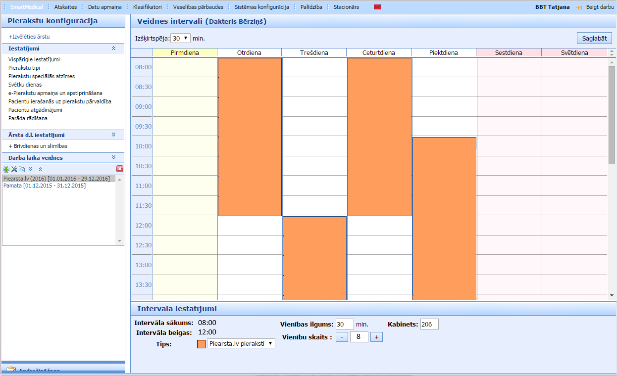 Nākamajā solī sagatavo ārsta darba grafika veidni (tas ir nedēļas ietvaros atzīmē dienas un laikus, kad ārsts veiks definētā pierakstu tipa pieņemšanu).
