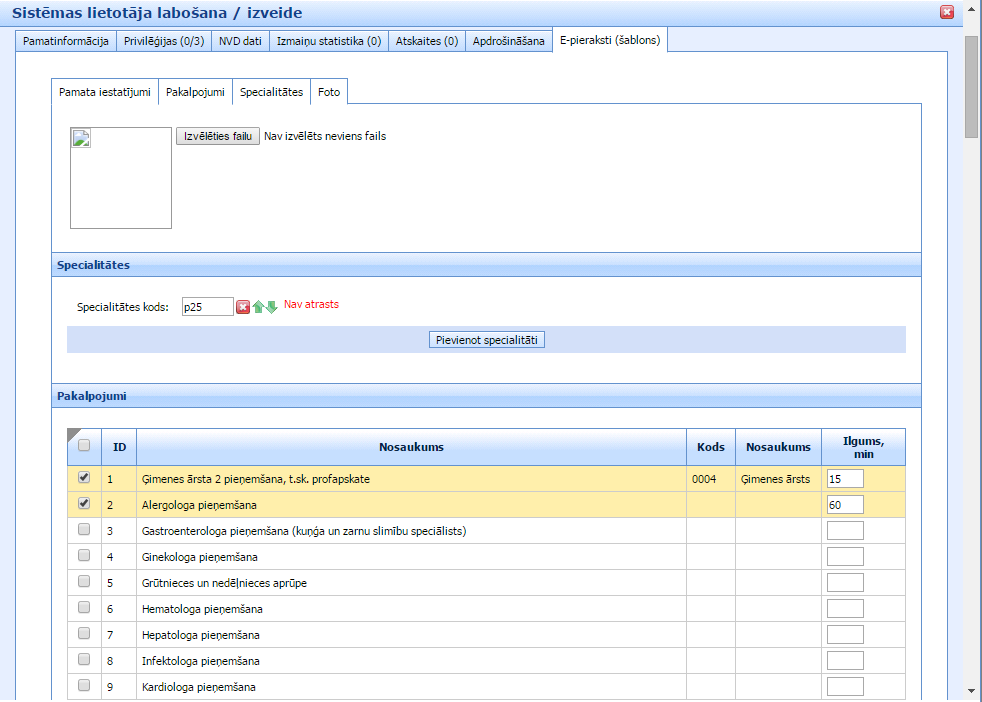 1. Aizpildot ārsta vizītkarti sadaļā Sistēmas konfigurācija -> Sistēmas lietotāji -> Lietotāju saraksts -> Sistēmas lietotāja labošana/izveide var atvērt uzreiz visas apakšsadaļas vienā logā, spiežot Ctrl uz klaviatūras un norādot ar peles kreiso pogu uz apakšsadaļām: