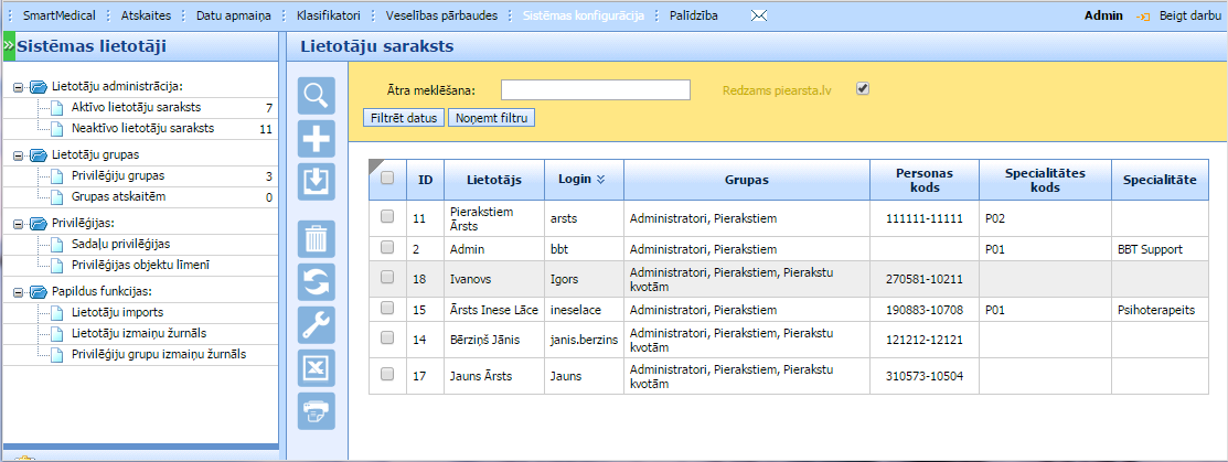 - sadaļā Sistēmas konfigurācija -> Sistēmas lietotāji -> Lietotāju saraksts filtrēšanas laukā, izvēlēties “redzams Piearsta.lv” un nospiest pogu “Filtrēt datus”