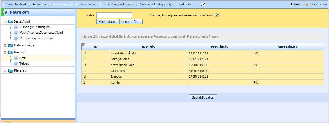 - sadaļā Datu apmaiņa -> e-Pieraksti -> Resursi -> Ārsti. Filtrēšanas laukā pēc noklusējuma jābūt izvēlētam parametram “tikai tie, kuri ir pieejami e-Pierakstu sistēmā”. Ja filtrēšanas parametrs nav atzīmēts, tad tas ir jāatzīmē un jāspiež poga “Filtrēt datus”.