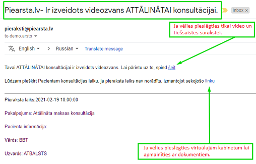 10 minūtes pirms ieplānotas video konsultācijas, sistēma automātiski izveidos video kabinetu un nosūtīs e-pasta paziņojumu ārstam un pacientam ar saiti uz video kabinetu.