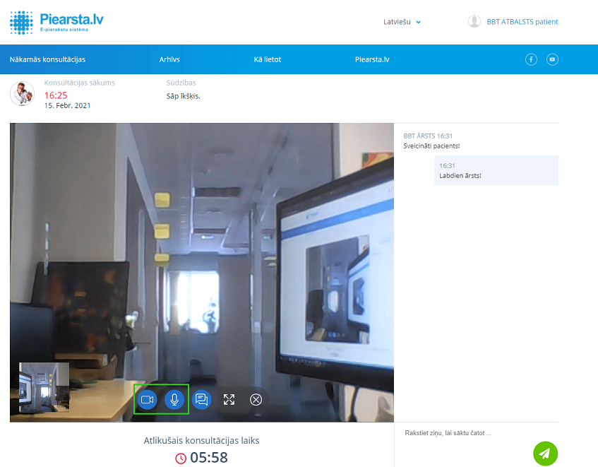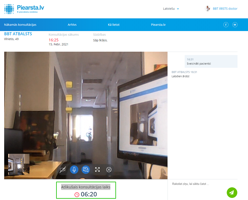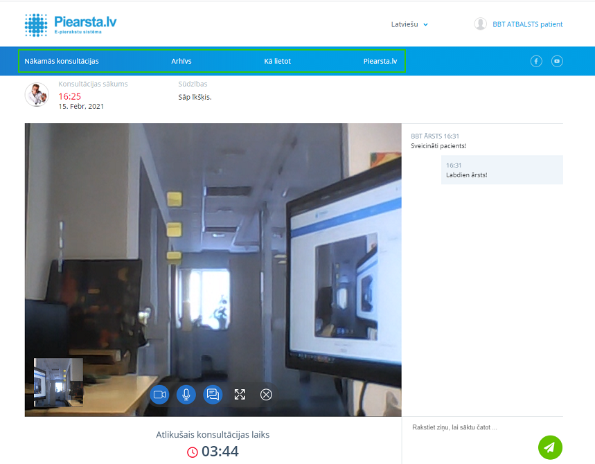 Sākoties video konsultācijai atvērās iespēja sarakstīties ar pacientu arī tiešsaistē.