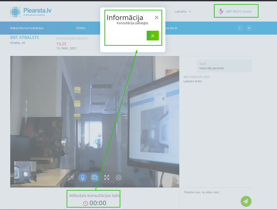 Beidzoties konsultācijas laikam izlec informācijas logs ar jautājumu vai konsultācija ir pabeigta. Nospiežot pogu “Jā” konsultācija tiek pārtraukta.